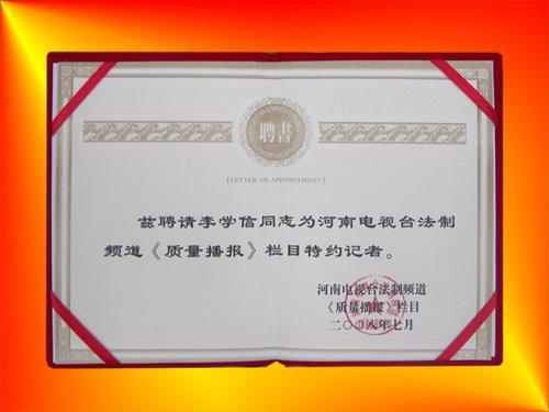 • 河南電視臺(tái)法制頻道《質(zhì)量播報(bào)》欄目特約記者 河南電視臺(tái)法制頻道《質(zhì)量播報(bào)》欄目特約記者