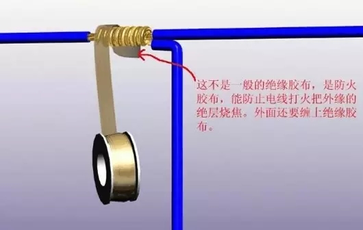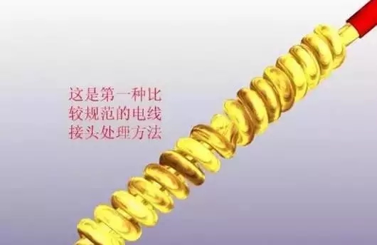 多用于吊項內(nèi),或比較高能的工程中,主線不能能弄斷,符線繞主線6--8周,吊頂內(nèi)的射燈,一路上要有很多燈就是這樣接法,用防火膠布纏在里面它的作用就是防止電打火燒壞東西這是在吊頂內(nèi)很重要的,外面在用絕緣膠布纏繞。