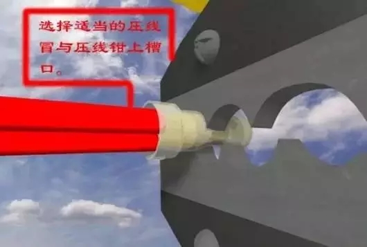下面的接法就是壓線冒接線法,這種方法是最規(guī)范和最實用的,但是它需要專用工具來做,壓線冒的壓線鉗來壓線,把壓電線用的專用鉗子,套在壓線冒上,用力壓緊就行了。